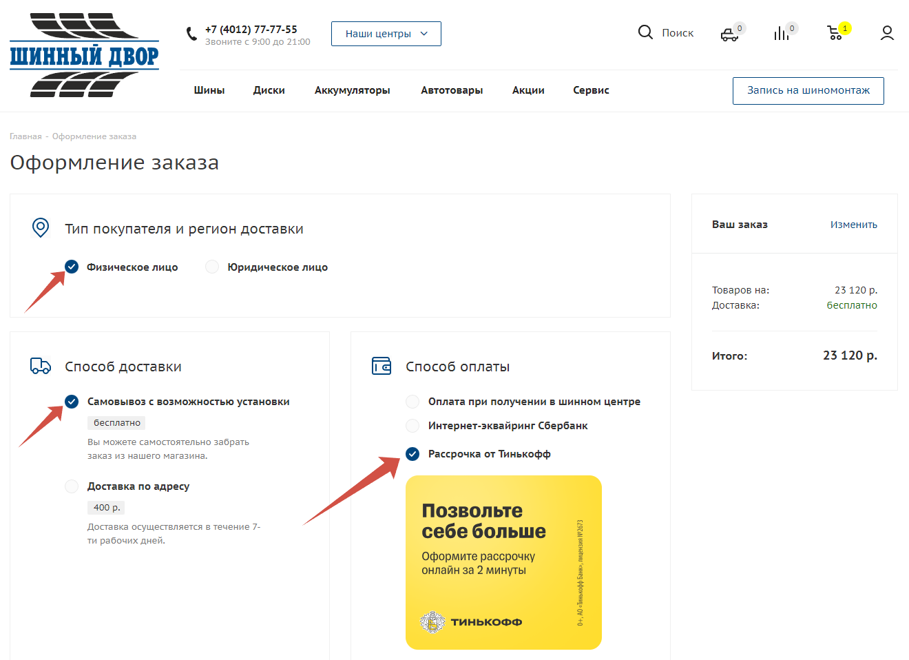 2) В форме оформления заказа выбрать тип покупателя "Физическое лицо" (акция не распространяется для юридических лиц); способ доставки "Самовывоз" (если вам нужна доставка в пределах Калининградской области, необходимо согласовать ее после оформления заказа); способ оплаты "Рассрочка от Тинькофф".