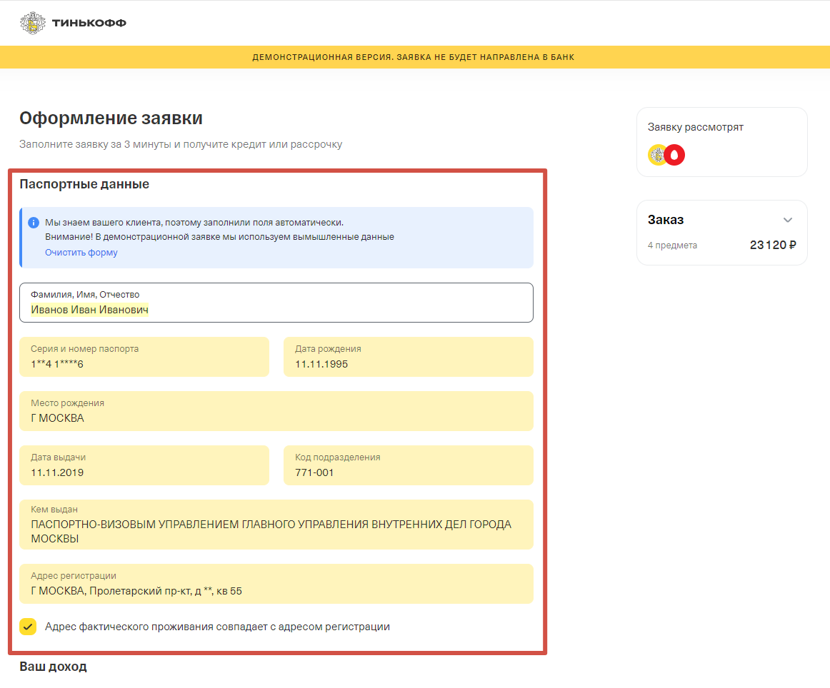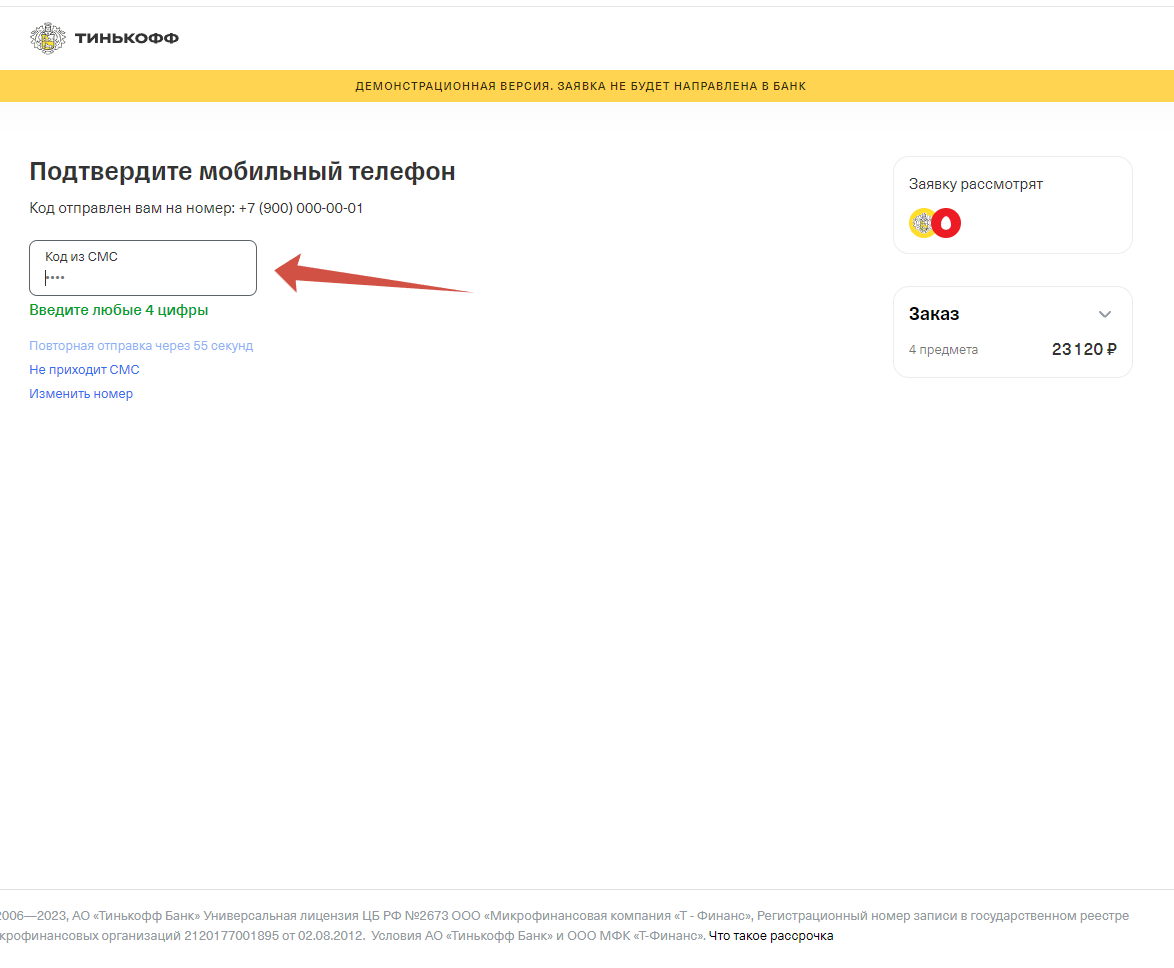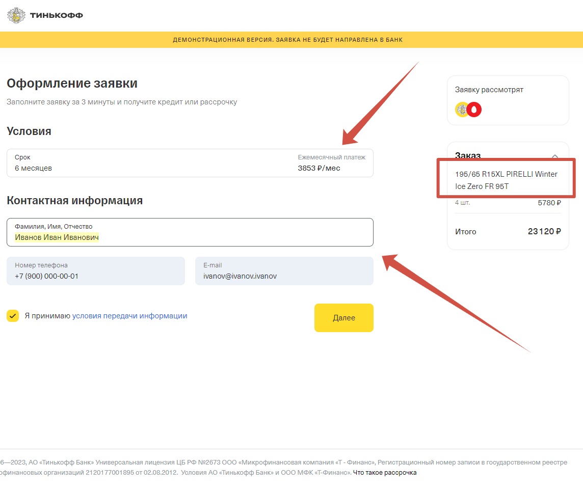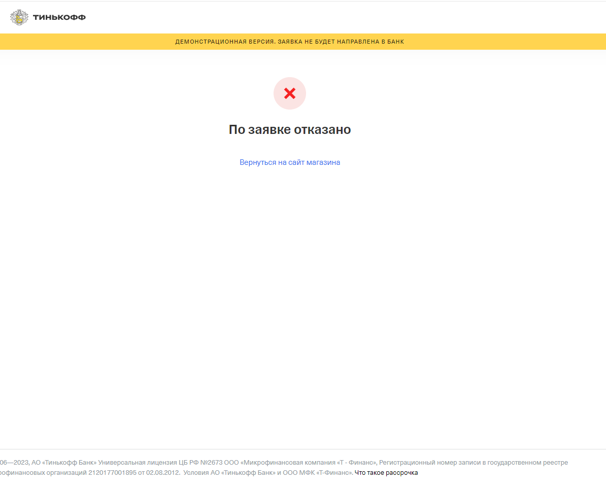 3) На следующем этапе будет сформирован заказ на сайте и вы будете перенаправлены на сайт www.tinkoff.ru для оформления заявки на рассрочку