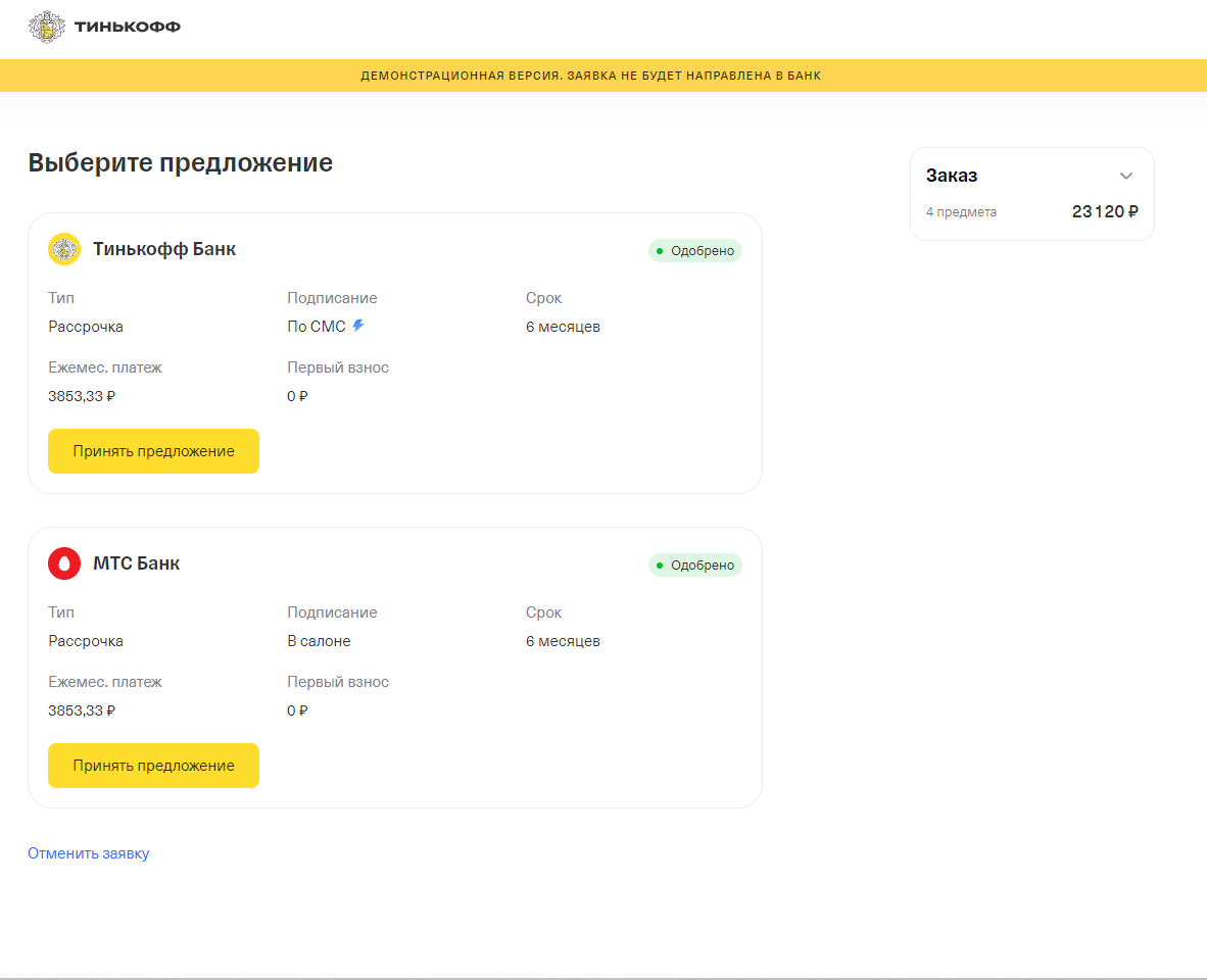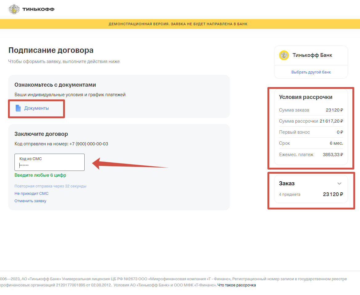 5) Дождитесь решения по вашей заявке. В случае отказа банком Вы будете возвращены на наш сайт. Если заявка будет одобрена, то вам будут предложены несколько вариантов (с одинаковыми условиями, но разными формами подписания кредитного договора). В указанном примере Вы выбираете подписание договора через СМС. В момент подписания договора у Вас будет возможность ознакомиться с документами по договору (они будут продублированы на указанный вами email). В блоке "Условия рассрочки" указана сумма заказа, ежемесячный платеж и сумма рассрочки (это сумма, которую получит продавец; разница между суммой заказа и суммой рассрочки - это скидка, которую предоставил Вам продавец, чтобы у вас не было переплаты по кредитному договору)